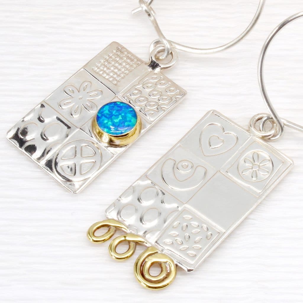 These modern asymmetrical earrings are handmade from sterling silver and showcase a stunning 6mm lab-grown blue opal triplet gemstone set in a brass bezel. One earring is adorned with the gemstone, while the other features a series of decorative brass hoops along the bottom. The silver surface has been deeply embossed with symbols and textures, creating an intersting surface pattern. Measuring 15mm x 22mm with a total drop length of 45mm, these earrings are suspended from sterling silver ear wires.