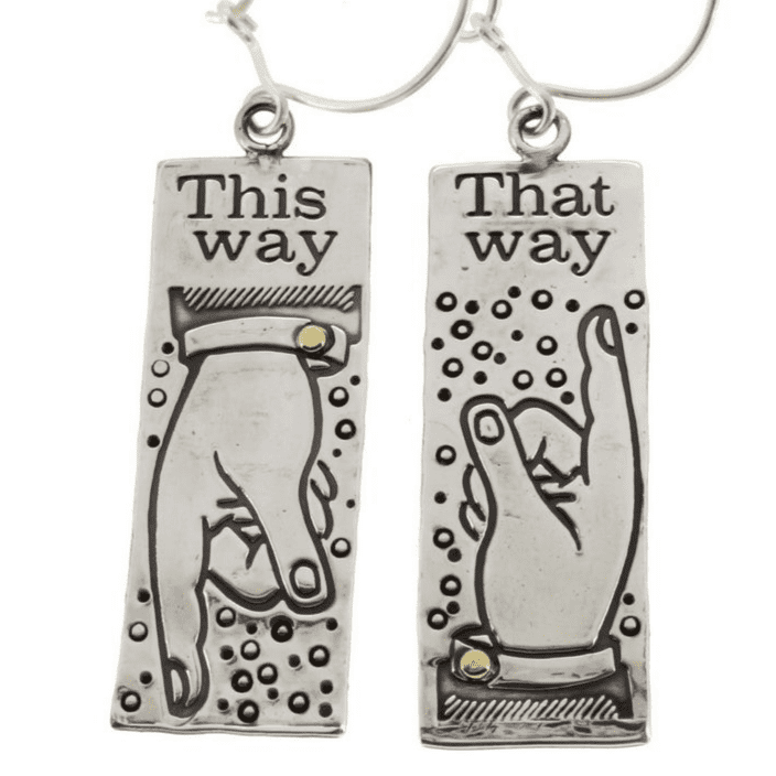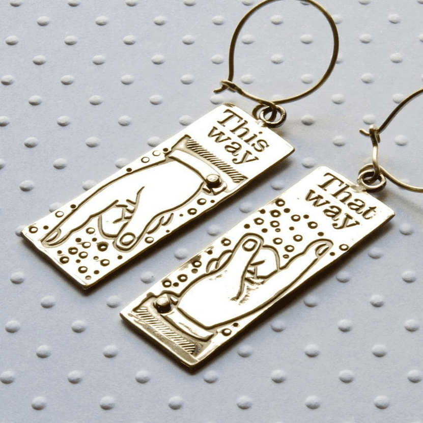 These pointing finger, 'This way, That way' earrings are made from sterling silver and 18 carat gold. Over the years we have collected a number of letterpress and wood block printing type face sets, that we have used numerous times in our work and in other creative projects. These earrings have been inspired by some large, antique wooden letterpress pointing finger printing blocks and they have an antique, retro look to them.