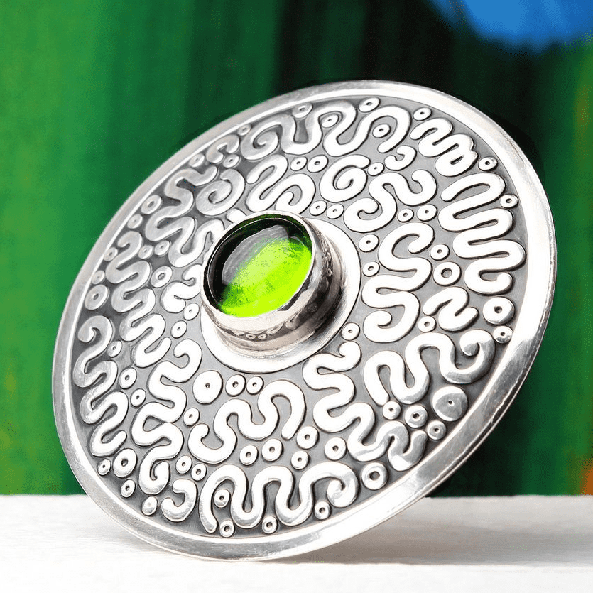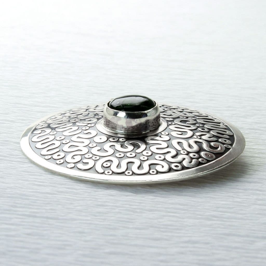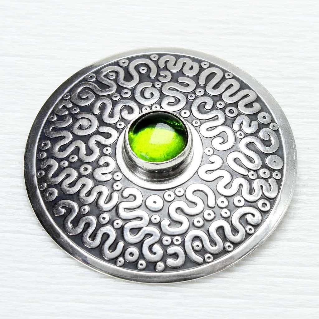 Squiggle pattern handmade brooch, sterling silver and a beautiful Peridot gemstone