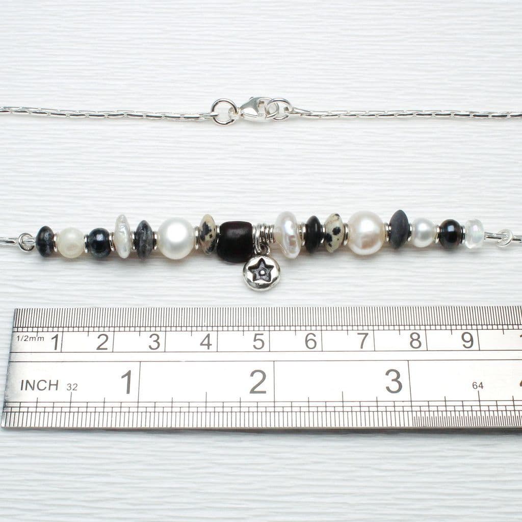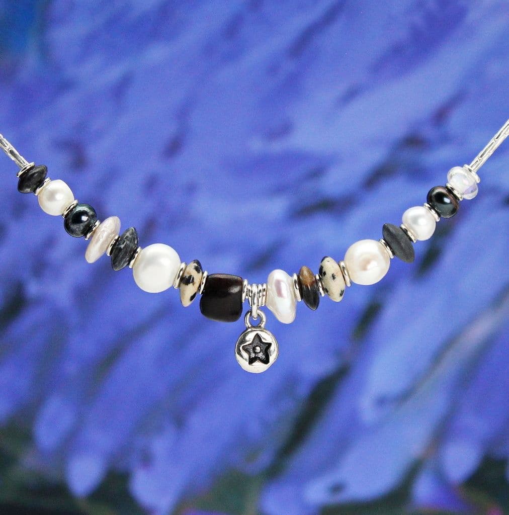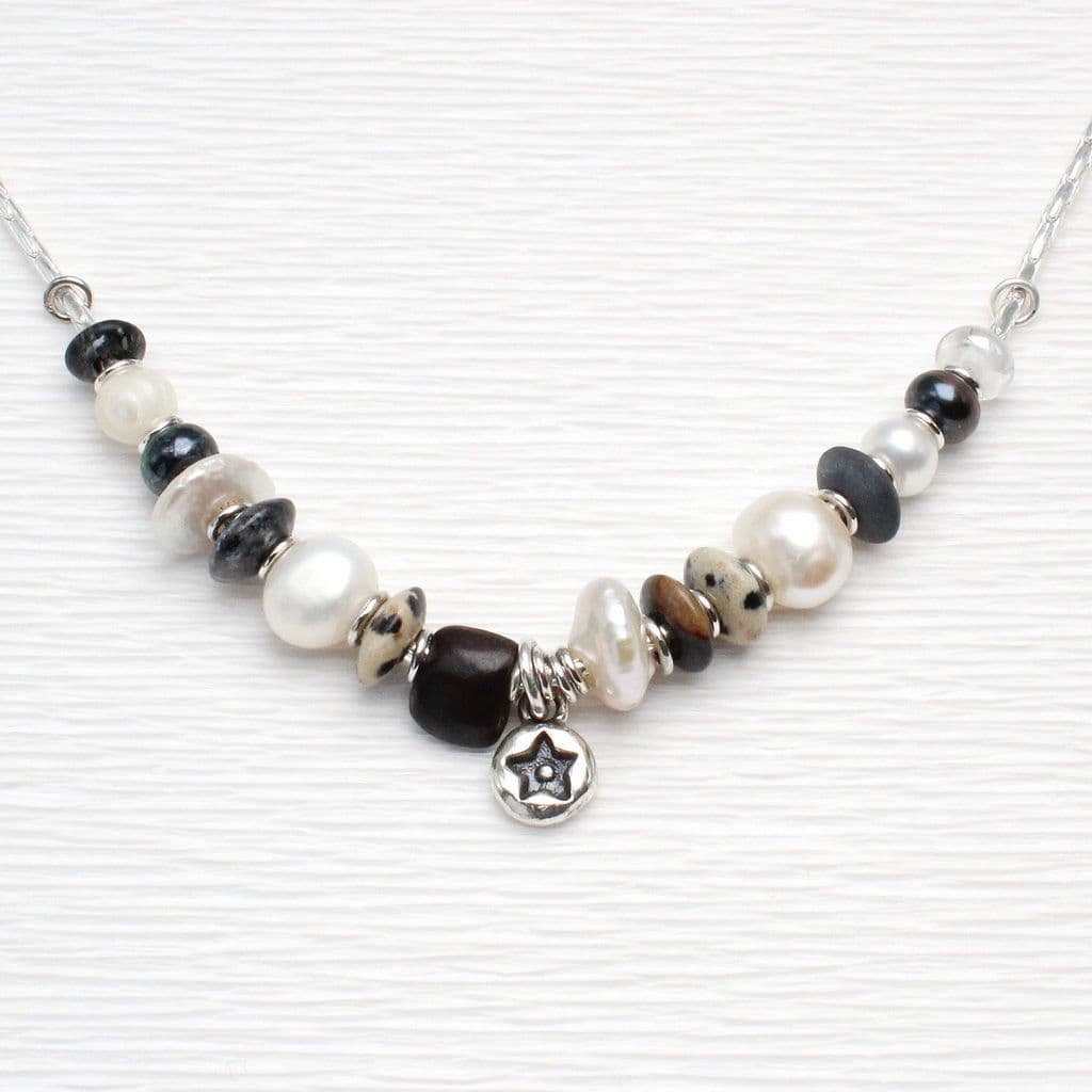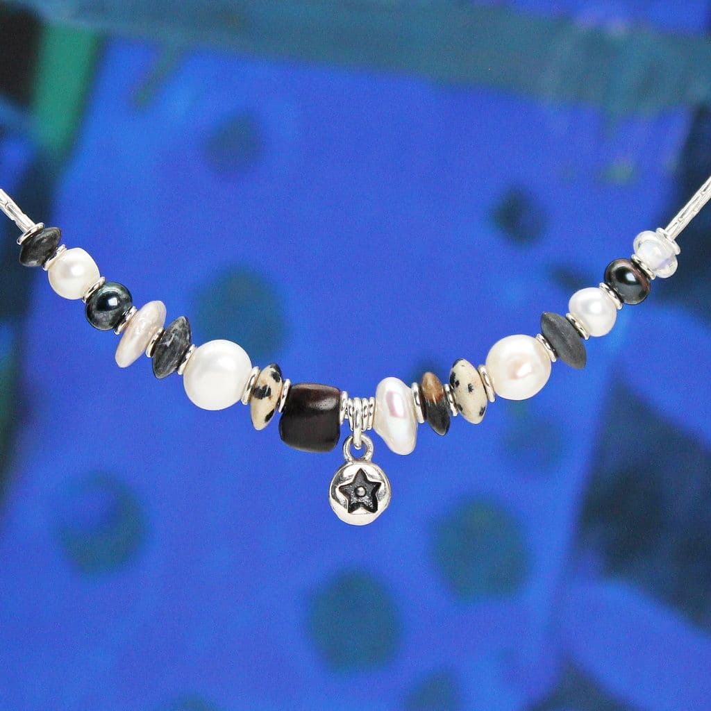 Star pearl necklace featuring freshwater pearls and a hand-carved wooden bead